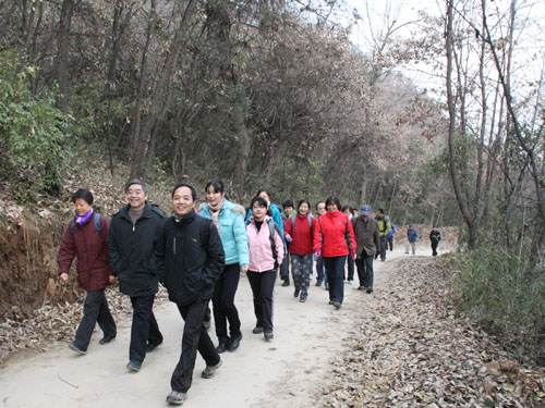 为了进一步增加登山活动的困难指数,更好地达到锻炼身体也锻炼意志的目的,下山选择了一条林间小径。本就有俗话说“上山容易,下山难”,而这次更是让大家真切地体验了一把下山的“难”。枯叶尽落的林间小径像是盖上了一条土黄的印花棉毯,且不说脚步的深浅难以估摸,更有随处凝结的霜冻和冰茬,为行进制造了更大的难度,一不小心就会脚下打滑,甚至跌个趔趄。于是大家不自觉地建立起相互帮扶的团队,手拉着手,臂挽着臂,说着笑话,喊着号子,以集体的力量战胜困难,走向胜利。