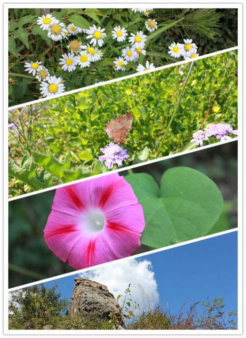 立足山巅,山体四周郁郁葱葱的草木和连绵起伏的群山尽收眼底。山脚下的村落和远处的高楼遥相呼应,遥看形似致密的网格,这种平时只能在网络地图上看到的景象,现在却一下子跳到了眼前,别有另一番身临其境的体验。远处天地合一的地方,一片云雾缭绕、虚无缥缈的景象,让人折服于大自然造化的神奇。此时未到深秋,所以没有红叶漫天,没有落英缤纷,取而代之的是因为高度不同、植被差异而深深浅浅交织的美妙画卷。正因为高度决定视野,我们到达顶峰,所以欣赏到了别样的风景。