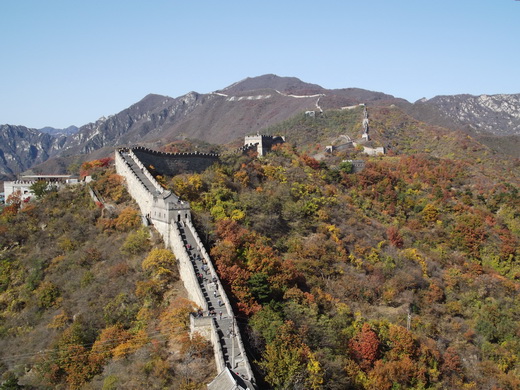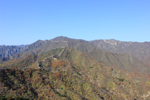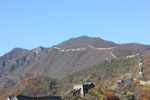 在门口合影后,大家便开始自由组合爬长城,身体素质比较好的,非常精力充沛地冲在前头领队,而平常在实验室呆着不运动的还没爬几十级台阶,就开始上气不接下气地喊累,如果要把我们这一行人分一分的话,前面的应该叫青壮年队,后面的就该叫老弱病残队,很不幸,平常从来将锻炼当成折腾自己的我便是老弱病残队的队员。拾级而上,我们这些老弱病残们终于爬到了长城上,极目远眺,长城蜿蜒在群山之中,一座座烽火台连接着百折千回的长城,很是壮观,望长城内外,群山伫立,漫山红遍,好一幅烂漫秋景。都说北京看红叶得去香山,对比之下,慕田峪长城的红叶反而有过之而无不及,去香山看红叶,说是看红叶,倒不如说是看人头攒动,丝毫没有在慕田峪长城欣赏红叶的惬意和享受。登上一座座烽火台,轻抚城墙上岁月留下的痕迹,感叹过去统治阶级的强大,在古时人力物力远不如今时今日的情况下,仍能修建出堪称奇迹的万里长城来抵御外敌入侵,虽然长城在今天已不再是能够抵御侵略的天堑,但是它带给我们的震撼必将永世传承。