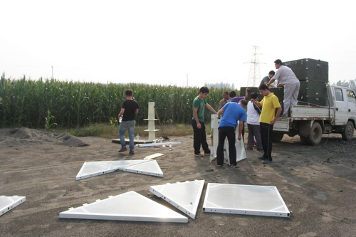七月,透蓝的天空,悬着火红的太阳,我们来到了外场试验场地,开展机载SAR试验。首先选好相对方便且经济的住处后,当天下午,便马不停蹄的开展工作:寻找仓库,定标设备的检查组装,定标场的勘查选址,选定定标器的布设位置,购买试验工具,与当地政府多个部门商谈定标设备场地等事宜。前期准备工作都做好后,团队成员被分成两组,每组队员分工明确,同时大家密切配合,精益求精,每次力争确保定标器的位置误差和指向误差最小,减小定标设备引入辐射、极化、几何和高程误差……