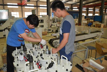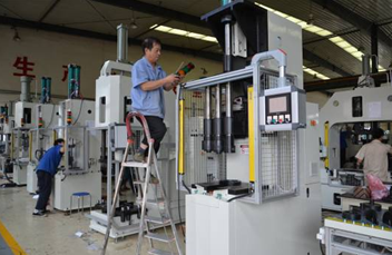 由于该项目时间紧、任务重、难度大,为了保证项目的顺利完成,项目组抓紧一切可利用的时间装配、调试设备。车间工人连续多日工作到晚九点,平均工作13-14小时。技术人员更是拿着图纸穿梭在设计室与现场之间解决技术难题。炎炎夏日,蒸笼般的车间,温度一度飙升到35摄氏度以上。在这样的环境里,安装调试、电路配线、液压配管等工作有条不紊地进行着。