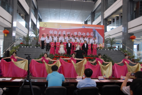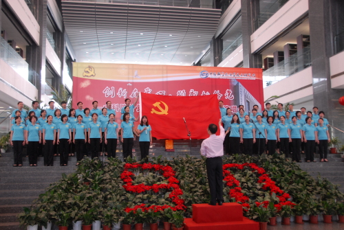 红歌会合理利用资源,利用所一层大堂的楼梯作为合唱台,并摆放了“90”字样的鲜花花坛,营造出高昂、喜庆的活动气氛。下午两点,红歌会正式开始,党委副书记兼副所长李锦涛致辞。他说,这次红歌演唱会的意义重大而深远,今年是建党90周年,也是计算所建所55周年。举办这次红歌演唱会既是庆祝党的90岁生日,又能通过红歌演唱弘扬民族文化,激发爱国热情,唱响时代主旋律。通过红歌表达计算所广大职工、学生“科研为国分忧、创新与民造福”的爱国爱党情怀,展现我们团结一心、奋勇拼搏,不断“从优秀到卓越”的崭新精神面貌。