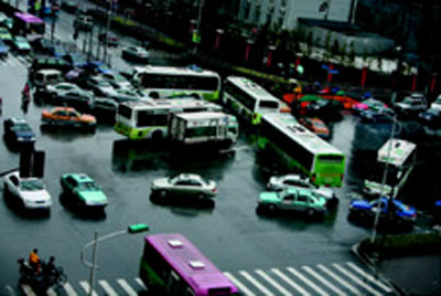 下图:上海复旦大学东南角十字路口雨后堵车。近乎标准头,远近的人物、汽车大小变化不大。