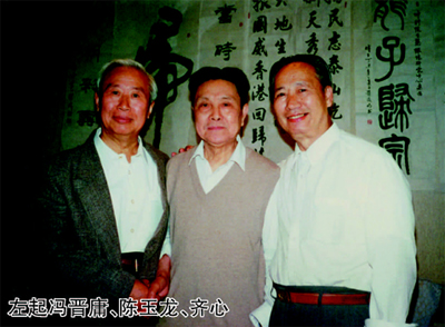 我记得,在1997年5月,香港回归前夕,齐心先生应邀参加中国科学院生态环境中心举办的笔会,在笔会现场,他写了一幅书法,还作了两幅国画,一幅虾,一幅令箭荷花,我观看了他画虾的每个动作,我问他:“画虾的哪一个部分最难?”他说:“最难的是虾的须子,因须子细长,要均匀而有力,还有点枯笔,所以需要长时间的练习才能画好。”他的每一笔都是那么的认真,那么的有力而精到,所有这些都给我留下了深刻的印象。在这次笔会现场,他与冯晋庸、陈玉龙二位先生都是最年长的,我们称他们为“三老”,还专为“三老”照了合影,这张照片,我至今珍藏着,看到他们,好像又把我带到了笔会现场,好像笔会就在昨天,好像又回到了那个年代!