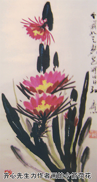 一次在和他的交谈中,我说:“我很喜欢您画的令箭荷花,什么时候有空请您给我作一幅。”2003年10月的一天,我接到他的电话,他说:“令箭荷花作好了,你到海淀老龄大学我的办公室来取吧!”第二天上午八点钟,我准时到了他的办公室,见他已在办公室等候我,他说:“我八点之前就来到办公室等你了。”我听后,真不知道说什么好。他在办公桌上摆放了三幅令箭荷花,他笑着说:“这些都是‘还账’的,你挑一幅吧。”我看后挑了一幅最鲜艳的。他问我:“为什么挑这幅?”我说:“书友送我的大多是书法作品,挂在家里太素净了,我喜欢鲜艳些的。”这幅令箭荷花为竖幅,3×1.5尺,画的左下角的压角章的印文是“白石门下”。据他的女儿齐红说,齐心先生早年曾拜白石先生的四子齐良迟先生为师,跟他学过画。这一次,我们进行了较长时间的交谈,最后合影留念,这张照片后来刊登在我的书法作品选中,同齐心先生给我作的令箭荷花一样,成了永久的纪念。