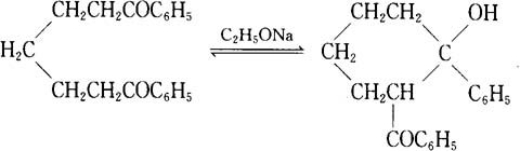 以后他系统地研究了1,6-和1,7-二酮及其衍生物的合成和性质,终于得到了1,7-二苯-1,7-庚二酮的环醇,并证明它们在室温和碱催化下达成平衡: