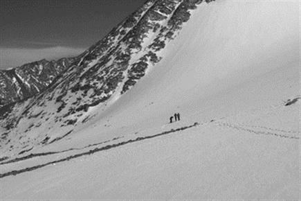 有了陈洪模的引导,攀登东支便有了底气。可走上去才发现并不简单,半天的阳光让坡面上布满的风吹雪特别松软,“哎呦”一声,左脚陷下去半米深,刚抬起左脚,右脚又陷了下去。不管怎样小心,还是东倒西歪。