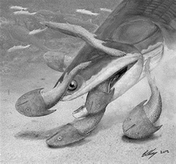 钝齿宏颌鱼生态复原图。在志留纪晚期的海洋中,这种1米多长的大鱼正在捕食无颌的甲胄鱼。(资料图片)