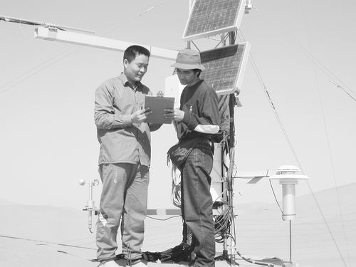 曾凡江(左)和科研人员进行沙丘气象观测。