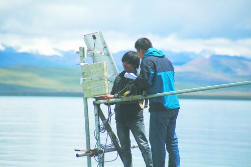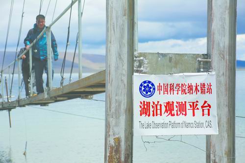 科研人员走上纳木错湖泊观测站。