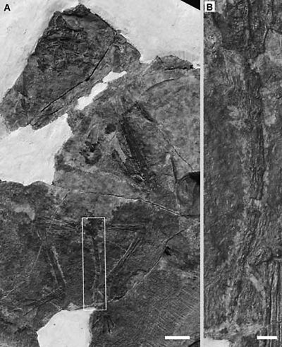 长尾蛙嘴翼龙化石(A)及尾部放大(B)。蒋顺兴供图