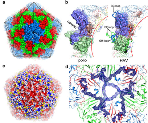 甲型肝炎病毒(HAV)每年在全球仍有140万感染病例,引起全球相关研究学者重视。经过多年紧密合作,来自中科院生物物理研究所、牛津大学、中国食品药品检定研究院以及北京科兴控股生物有限公司的科学研究人员,在甲型肝炎全病毒三维结构领域取得了重大突破。该研究不仅揭示了甲型肝炎病毒的“独有的结构特性”、“极强的稳定性”、“特殊的脱衣壳机制”,而且从三维结构角度阐述了甲型肝炎病毒的进化关系。相关研究论文于2014年10月19日在《Nature》杂志上在线发表。