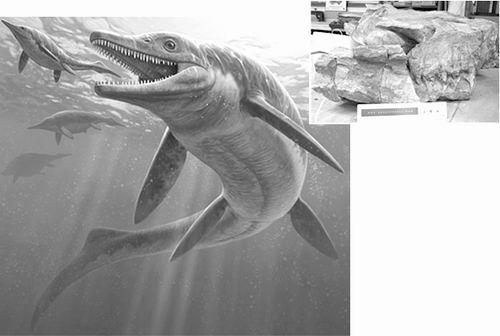 近日,研究者宣布发现了第一只“海怪”——生活在2.44亿年前,拥有大骨架(小图所示)和尖利牙齿的长达8.6米的海栖爬行动物,被命名为Thalattoarchon saurophagis。