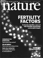 利用基因组学方法对线虫(Caenorhabditis elegans)所做的一项研究工作,识别出了DNA压缩、染色体分离和生育能力所需要的专门针对精子生成的因子,其中很多会引起小鼠雄性不育。该研究所获得的结果为识别雄性不育的原因提供了新机会,为男性避孕提供了可能的目标。本期封面所示为线虫的一个雄性性腺中的细胞核正在经历精子生成过程,该性腺已被固定,并用荧光标记物染了色。图中所示DNA为红色,组蛋白H2A的变体HTAS-1的存在示为绿色,图中的黄色表示位置重叠(colocalization)。