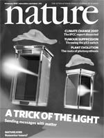 本期封面所示为一个引人注目的实验。在一个盒子中停止和熄灭的一个光脉冲,却在位于另一地点的一个完全不同的盒子中被恢复过来,并沿原路送回了。在实际的实验中,一个慢的光脉冲在一个玻色—爱因斯坦凝聚态体系(第一个“盒子”)中被停止和存储起来,然后在一个相距160微米的完全不同的凝聚态体系中被恢复过来。信息是通过将该光脉冲转变成一个比光容易操控的物质行波来传输的。该实验表明,共振激光场与玻色-凝聚态原子云之间的相互作用,为用物质来操纵光提供了一个强有力的手段,反之亦然。这种量子操控在量子信息处理及原子波函数的受控雕刻中有可能派上用场。