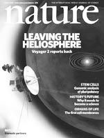 2007年8月30日,“旅行者2号”开始穿过“激波边界”。这是由太阳与银河系其他部分相互作用所产生的一个边界。在这个地方,超音速的太阳风向外压迫周围环境中的星际物质,因而会突然减速。本期Nature上5篇Letters论文发布了该探测器发回的数据。“旅行者2号”的穿越点与太阳的距离比“旅行者1号”要近大约15亿公里,说明日球是不对称的。来自等离子体实验、低能粒子、宇宙射线、磁场和等离子体波探测器的结果,显示了一个复杂的、动态的激波,其本身的改变发生在几小时内,而不是几天内。下一个探测器穿过“激波边界”也许要在几十年之后,但远距离观测现在可以填补这段时间所留下的空白。Wang等人所作的研究就证明了这一点:他们报告了STEREO A和B宇宙探测器对日鞘中高能中性原子所作的测量,这两个探测器与“旅行者”探测器同一时间所做的近距离观测形成互补。在News & Views文章中,Randy Jokipii对“旅行者”所获得发现的意义进行了分析。另外,本期Nature还发布了“旅行者”探测任务行星阶段的历史图片。与此同时,“旅行者1号”和“旅行者2号”正在向星际空间进发,所以可能还会获得更多发现。