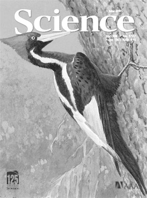 本期封面是美国康奈尔大学鸟类实验室收藏的雄性象牙喙啄木鸟的水彩画,画家于1935年在路易斯安那州东北部的辛格写生绘画的。该森林在20世纪40年代初期被砍伐以后,人们猜测这种鸟在北美灭绝了。最近在距这个地方300公里以北的阿肯色州的“大树林”地区这种鸟被重新发现。