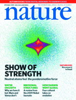 1957年发表于Nature杂志的一篇论文,曾描述了作用在洛伦兹电磁力方程所产生的一个非均匀电场中带电粒子上的一种力。研究人员很快意识到,这种被称为“有质动力”的力有可能被用来束缚和控制电子。但是,这种力很弱,而且直到现代激光出现之后,它才在粒子加速器和惯性约束聚变装置中得到利用。现在,这种力的一种新的存在形式已经被发现。Ulrich Eichman等人对作用在短脉冲激光场中的中性原子上的以前没有被人们考虑过的强运动力进行了观察。作用在电子上的“有质动力”是它们的驱动机制,能造成中性原子的超强加速,加速作用比地球引力加速大14个数量级。如此强的一种力可能导致基础物理和应用物理中新应用的问世。本期封面所示为在与一个聚焦的激光束相互作用后中性氦原子所发生的偏移。