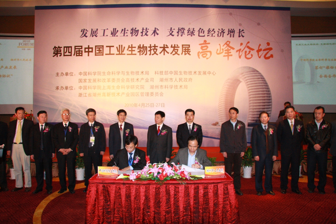 由中科院生命科学与生物技术局、科技部中国生物技术发展中心、国家发展和改革委员会高技术产业司和湖州市政府主办的第四届中国工业生物技术发展高峰论坛,4月25至27日在浙江省湖州市召开,国内近300名专家学者、企业代表参加了会议。中科院副院长李家洋出席开幕式并致辞。开幕式上,张知彬局长与湖州市长马以分别代表中科院生物局和湖州市政府签订了推动生物产业发展全面合作框架协议。同时,中科院生物产业科技创新联盟伙伴成员举行了签约仪式,14家企业加入创新联盟。