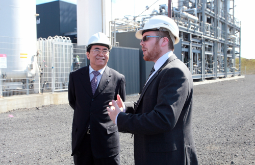在冰岛期间,白春礼一行访问了碳循环国际公司(CRI)。公司首席执行官K-C Tran博士介绍了该公司在利用地热发电电解水产生氢气,并与地热蒸汽中提取的二氧化碳反应从而生产出甲醇的独特“甲醇经济”理念。上海有机化学所所长丁奎岭也向对方介绍了中科院在化学利用二氧化碳领域的研究工作。会谈结束后,白春礼一行实地考察了位于冰岛西南部雷克雅内斯半岛上的地热发电站和甲醇生产工厂George Olah Plant,并与冰方就未来合作进行了讨论。