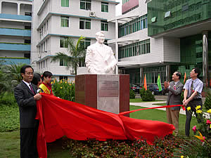 广东省微生物所的前身是中科院中南真菌研究室,而该研究室是著名微生物学家邓叔群院士提议创建的。邓叔群等老一辈科学家开创的科技事业,经过几代人的前仆后继,取得了非凡的业绩。为缅怀老一辈的功勋并激励后人,庆典之后,该所为新落成的邓叔群塑像举行了揭幕仪式。朱作言、杨新潮、郭俊以及邓叔群的女儿邓颐为邓叔群塑像揭幕。 |