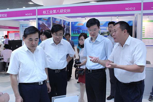 上海嘉定育成中心副主任贾增强(右一)向上海市政府副秘书长徐逸波(左一)、上海市嘉定区委书记马春雷(右二),上海市嘉定区委副书记、区长杲云(左二)介绍育成中心参展项目