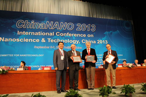 中国国际纳米科学技术会议由国家纳米科学技术指导协调委员会主办,国家纳米科学中心承办。从上届会议开始,设立了中国国际纳米科学技术会议奖ChinaNANO Award。本届ChinaNANO Award获奖者是:瑞士洛桑联邦理工学Michael Grätzel教授,德国马普高分子所Klaus Müllen教授,美国加州大学伯克利分校Omar M. Yaghi教授。他们分别在染料敏化太阳能电池、有机功能材料与碳材料、金属有机骨架材料方面做出开拓性的贡献。会议还向张翔教授、Michael Crommie教授颁发了特邀报告奖。在开幕式上,本次大会主席、中国科学院院长白春礼为获奖者颁发了奖牌。