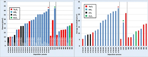 图1 2013年公布的s分量(左图)和2012年公布的p分量(右图)的损伤阈值竞赛结果;标注红色五角星的结果为上海光机所的参赛样品,标注绿色方块的结果为s分量阈值最高的参赛样品