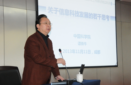 11月11日至12日,中国科学院局级领导信息化工作研讨会在成都市举行。中国科学院副秘书长谭铁牛出席研讨班。会议特邀国家信息化专家咨询委员会常务副主任周宏仁,北京航空航天大学前校长、中国科学院院士李未,工信部国家互联网络应急中心副主任、总工程师云晓春,国家信息中心信息化研究部副主任于施洋作专题报告。中国科学院条财局副局长王凡主持会议。
