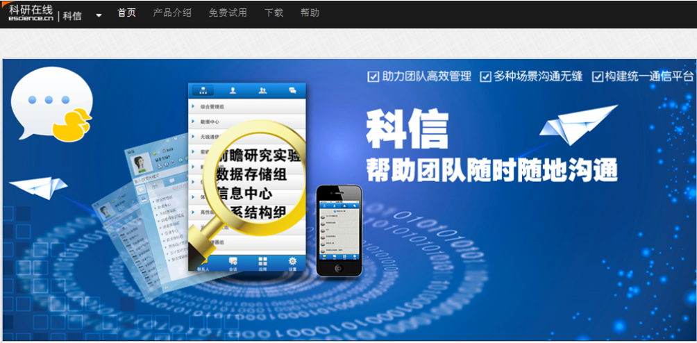 科信,是面向组织或团队的即时通讯平台。支持中国科技网通行证(包括院邮件系统账号)登录,能够无缝同步院邮件系统的单位组织架构、同步科研在线团队文档库中的团队架构。具有文本通讯、语音视频、文件传输、文件共享、群组聊天、远程协助等功能,支持PC、手机等多种平台版本,帮助团队成员随时随地沟通。服务网址:http://dchat.escience.cn