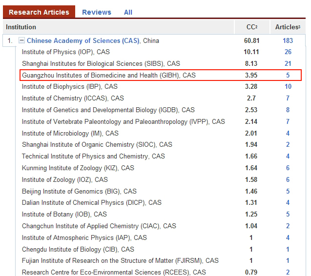 “自然亚洲”(NatureAsia)网站最新亚太地区“自然出版指数(NPI)”显示:中科院广州生物医药与健康研究院科研人员过去12个月内在《自然》(Nature)及其系列期刊上共发表论文5篇,总贡献点数(Corrected Counts:CC)为3.95,在中科院所有研究单位中列第三。