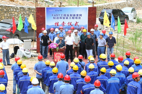 索网制造与安装工程是500米口径球面射电望远镜工程的主要技术难点之一,其关键技术问题主要包括:超大跨度索网安装方案设计、超高疲劳性能钢索结构研制、超高精度索结构制造工艺。该工程进入正式实施阶段则标志着上述三个主要技术难题已经得以解决。