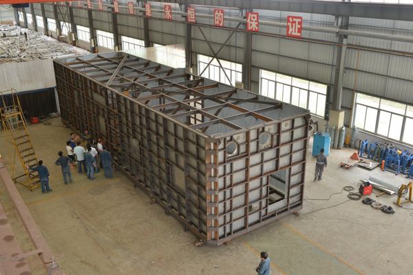 8月7日凌晨2:00两辆6轴半挂超低平板挂车同时运载壳体,两台吊装能力为50T和25T的吊车配合押运。经过近16个小时的运输和现场困难排除,7日下午16:30两段热室壳体顺利卸装至临时摆放位置。8月8日上午通过240T大型吊车成功对两段壳体进行起吊对接就位,热室壳体完成了预组装。
