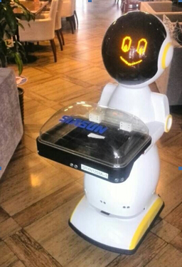 每当顾客走进餐厅,智能送餐机器人便会来到餐桌旁,用流利、标准的普通话介绍餐厅的招牌菜品。当客人点完餐后,机器人可以自主走到取餐处,由工作人员将菜品放到机器人的托盘上,并通过遥控设备输入所属桌次和菜品确认信息。当机器人移动至餐桌旁时,语音提示顾客自取或者等服务员将菜品以及饮料端至座上。当菜品取走后,机器人语音提示顾客或服务员触碰相关返回按钮完成整套送餐任务。