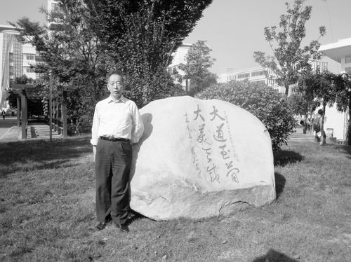 严加安身边的碑石上镌刻的是他为母校镇江中学120周年校庆的题词:“大道至简、大美天成。”