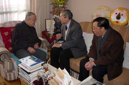 当许智宏副院长来到寓所时,早已等候在电梯口的谈老,即迎上前与许院长握手。许智宏副院长向他介绍了中科院知识创新工程进展及上海复旦大学生命科学院招聘人才的情况。谈老听得特别的仔细认真,还一起交流了看法。在谈到从海外招聘人才时,谈老特别叮嘱一定要把好人才使用的适应性,要结合本土的实际,让招聘来的人才真正发挥作用。谈老还特别关心中国科学院,不时地问起中科院有关研究所的一些情况,当得知贝时璋老先生身体很好时,他对老朋友的深深怀念之情,让人感动。