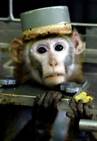 新浪科技讯 一只戴着金属帽以遮蔽置于其头上电极的猴子,2003年4月15日在莫斯科太空医学中心的一处实验室,被俄罗斯的研究人员以金属环紧紧扣住颈部,准备接受有关太空生活对动物健康影响的实验。