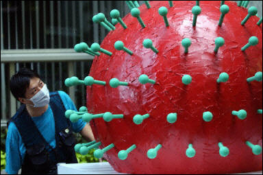 世界卫生组织严重急性呼吸系统综合症(非典)全球会议在马来西亚首都吉隆坡举行。1300多名各国医学专家和卫生官员参加了于6月17日至18日举行的此次非典全球会议。图为一名参观者正在参观SARS冠状病毒的模型。