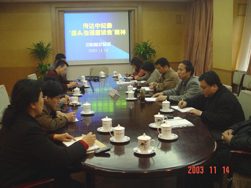 彭局长首先介绍了几个兄弟科技部门就开展源头治理工作为题在座谈会上的发言情况,而后重点传达了中央纪委常委、监察部副部长黄树贤同志的重要讲话。