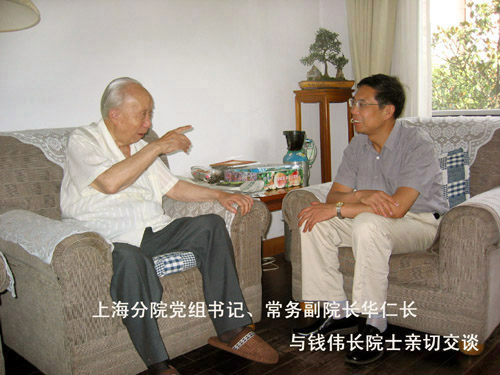 华书记还前往上海大学看望慰问了我国著名的力学与数学家钱伟长院士。在钱伟长院士的书房里,华书记与钱老进行了亲切交谈。钱老谈得最多的自然是教育与科技方面的话题。他说,高校一定要加强与科研院所的合作,双方通过优势互补,一定能取得很好的发展前景。我一直强调要合作,学科领域要交叉。上海科技大学与上海第二工业大学合并成立的上海大学就是很好的合作例子。现在的上海大学已经在全国有了一定的影响,今后我们一定要与上海分院加强更多的合作,希望上海分院给予支持和帮助。华书记表示,上海分院系统各研究所要发展要进步,也必须走出去与其他高校的合作。我们过去有很好的合作事例,今后也一定会更好的开展合作。最后,华书记感谢钱老对科学院的重视和高度的评价,并嘱咐他要注意休息,保重身体。