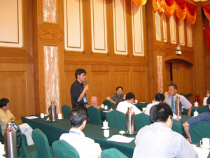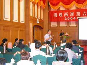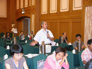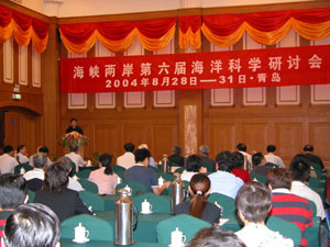 厦门大学戴汉民教授在大会讨论中发言。 为期三天的“海峡两岸第六届(2004年)海洋科学研讨会”于8月30日在青岛圆满结束。中国科学院海洋研究所常务副所长孙松研究员和中山大学(台湾)海洋地质及化学研究所教授刘祖乾分别主持了大会讨论总结会议。