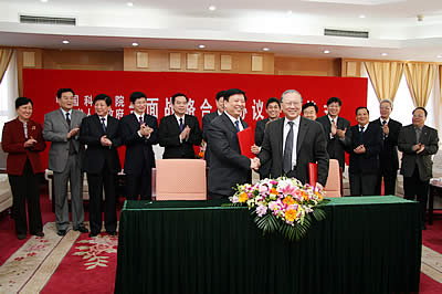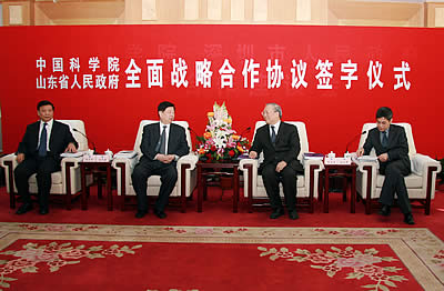 3月6日上午,中国科学院与山东省人民政府在北京签署了《中国科学院 山东省人民政府全面战略合作协议书》。全国人大常委会副委员长、中国科学院院长、党组书记路甬祥,山东省委副书记、省长姜大明分别代表双方签字。中国科学院副院长施尔畏,中纪委驻中科院纪检组组长王庭大,中科院副秘书长邓麦村,山东省委书记、省人大常委会主任姜异康,山东省委秘书长王敏,山东省副省长李兆前等领导出席了签字仪式。施尔畏副院长主持了签字仪式。 姜异康在会谈中对中科院长期以来为山东省经济社会发展给予的支持表示衷心感谢。他指出,山东省不光是工农业大省、海洋大省,还是人口大省。山东在加速发展、迎接下一个发展周期的准备过程中,必须转型蓄势,提高科技含量,加快科技进步和自主创新。希望通过签署新一轮的全面战略合作协议,使中科院在山东的科研机构得到更好的加强,其作用得到更加充分的发挥。山东省将为中科院科研机构的工作开展提供全方位的服务和保障,使山东能够真正成为一个人才聚集、事业发展的平台,成为建设创新型社会、创新型省份的一个重要平台。 路甬祥在讲话中指出,中科院与山东省的合作经验证明,科技与科技转化需要两个动力,一是科技创新的动力,二是经济社会发展需求的动力。双方的成功合作对于共同应对金融危机,支持科学发展,建设创新型国家,走更加可持续发展的经济增长道路具有深远意义。在接下来的合作中,双方将以农业、海洋与海岸带、先进材料与先进制造、生物产业、信息产业、生态环境保护等领域作为合作重点,进一步解放思想,创新体制机制,共同探索一条提升自主创新能力,建设有中国特色的创新体系,建设社会主义创新型国家的道路。 山东省委、省政府有关部门,中科院办公厅、院士工作局、资环局、高技术局、院地合作局、规划战略局、人教局、农业项目办公室、及沈阳分院、海洋研究所、青岛生物能源与过程研究所、烟台海岸带可持续发展研究所等单位领导出席了签约仪式。