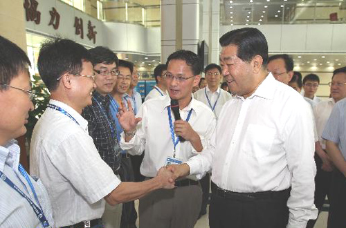 参观结束后,贾庆林与科学家们一一握手致意,并发表重要讲话。他希望广大科研人员再接再厉,继续做出新的成绩,为实现科教兴国、人才强国战略,为实现2020成为创新型国家的目标做出自己的贡献。
