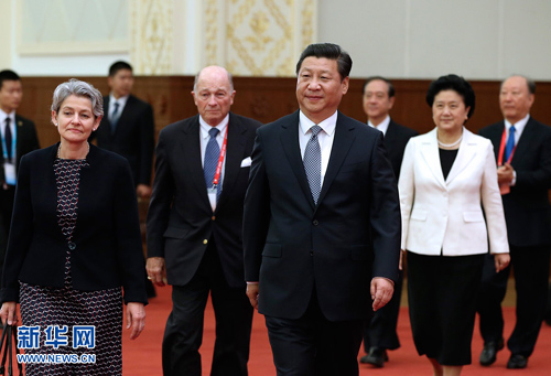 6月3日,国家主席习近平在北京人民大会堂出席2014年国际工程科技大会并发表题为《让工程科技造福人类、创造未来》的主旨演讲。这是会议开始前,习近平会见联合国教科文组织总干事博科娃、国际工程与技术科学院理事会秘书长萨尔曼等与会外方代表。 新华社记者 兰红光摄