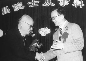 在纪念王淦昌90寿辰暨学术报告会上,温家宝向王淦昌表示祝贺