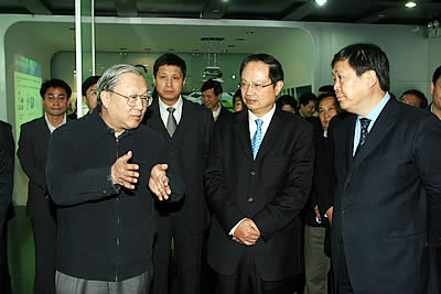 路甬祥(左一)在王建宙(左二)、张春江(左三)的陪同下在中国移动新业务演示厅调研 11月10日,全国人大常委会副委员长、中科院院长路甬祥,副院长阴和俊到中国移动通讯集团公司调研,考察了该集团实验室及研发成果展示,并听取了中国移动总裁王建宙、党组书记张春江等所作的中国移动的总体发展情况、技术创新成果研发进展介绍。