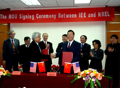 签字仪式由中科院国际合作局局长吕永龙主持。高技术局副局长肖云汉、美国可再生能源实验室光伏中心主任Lawrence Kazmerski、电工所副所长许洪华等出席了仪式。