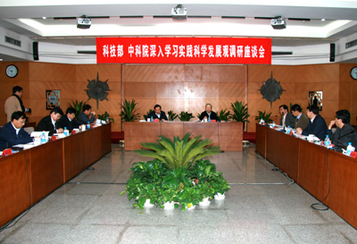 11月17日,全国政协副主席、科技部部长万钢,副部长曹健林、杜占元等科技部领导来到中科院,就科研管理机构如何深入学习实践科学发展观、如何将科学发展观在科技界落到实处等相关问题与全国人大常委会副委员长、中科院院长路甬祥,常务副院长白春礼,副院长詹文龙、阴和俊,秘书长李志刚等中科院领导举行了座谈,白春礼主持座谈会。