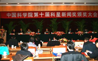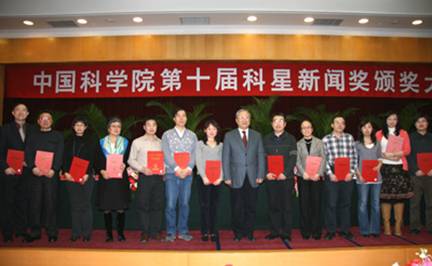 1月13日,“中国科学院第十届科星新闻奖”颁奖大会在京举行。全国人大常委会副委员长、中国科学院院长路甬祥,院党组副书记方新,中国科协副主席赵忠贤,中科院副秘书长曹效业,以及首都中央新闻媒体的有关领导出席大会并为获奖人颁奖。中国科学院新闻发言人、办公厅主任蒋协助主持大会。获奖记者代表、新闻单位代表、中国科学院京区研究所代表参加了会议。 “科星新闻奖”设立于1990年,旨在表彰新闻工作者在宣传报道中国科学院改革发展与科技创新中的优秀作品,促进提高科技新闻质量,推动科技新闻宣传不断进步。近年来,“科星奖”已受到新闻媒体和科技界越来越多的关注。此次参评作品是2006年7月1日至2008年6月30日间公开发表的新闻作品。所有获奖作品收录于近日出版发行的《创新年轮 攀登足迹—中国科学院第十届“科星奖”获奖作品选》中。 据悉,本届活动共收到三百多部申报作品。来自科技新闻界和科研学术界的专家评委们,本着公开、公平、公正的原则,经过严谨、细致的评审,共评出90件优秀作品,有83位作者受到奖励。这些参赛作品,尤其是获奖作品,如光明日报金振蓉同志采写的《伟大时代呼唤杰出人才》、人民日报赵永新、廖文根同志采写的《防灾减灾,牵动两院院士心》,中央人民广播电台李仁主同志编制的《国家的需要就是我的责任》,中央电视台庄园等同志制作的《国家大科学工程提升我国科技原创能力》,通过报纸、电台、电视台等各种新闻宣传途径,在报道中国科学院知识创新工程进展、反映创新思想、传播创新理念、弘扬科学精神等方面发挥了重要作用。另外,新华社吴晶晶、科技日报李大庆等十名同志勤于耕耘,获得了本届“科星新闻奖”的“丰产奖”。 颁奖大会上,方新代表中国科学院党组,向获奖者表示热烈的祝贺,向新闻界对中科院创新发展的关注和支持表示感谢。她希望中科院的科技创新能够为广大新闻工作提供更加丰富的素材,新闻记者能够创作出更加优秀的新闻作品,传播科学思想、弘扬科学精神,为深入贯彻落实科学发展观、推动有中国特色的国家创新体系建设营造更加良好的舆论氛围。