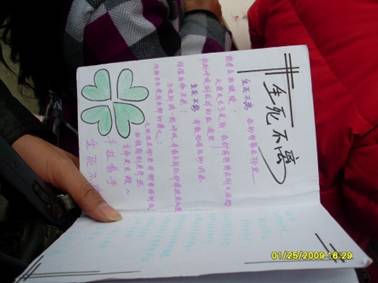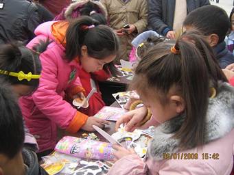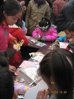 活动的下一个环节是为每位小朋友发放10张贺卡及彩笔,在贺卡上写下自己的新年祝愿,并将这些贺卡送给周围的亲朋好友,再将这些朋友的祝福和签名写在一张贺卡上。在初一下午的活动中,将根据贺卡上的签名数量和祝福语的情况评选出最佳爱心小天使、最勇敢爱心小天使、最佳创意等奖项。